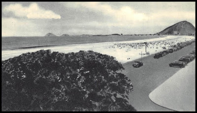 1. 1919. Os melhoramentos urbanos após o alargamento da Av. Atlântica em frente à Praça do Lido (antiga Praça 26 de Janeiro). Notar que o Copacabana Palace Hotel nem existia e na parte superior direita o Pico do Inhanga. A amurada visível é o terraço existente em frente à praça.