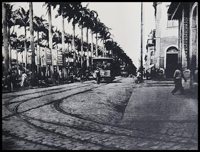 8e. Um registro fantástico da Rua Visconde de Itaúna por volta do final do século XIX. Um bonde puxado à burros segue no sentido do Campo de Santana. À direita está o Canal do Mangue com suas palmeiras.