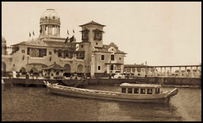 38a. O Pavilhão das Grandes Indústrias posicionava-se diante da enseada artificial conforme visto nesta fotografia. Observar ainda à esquerda o Pavilhão do Serviço Meteorológico (foto 50) e ao fundo central a cúpula do Pavilhão de Festas (foto 45).